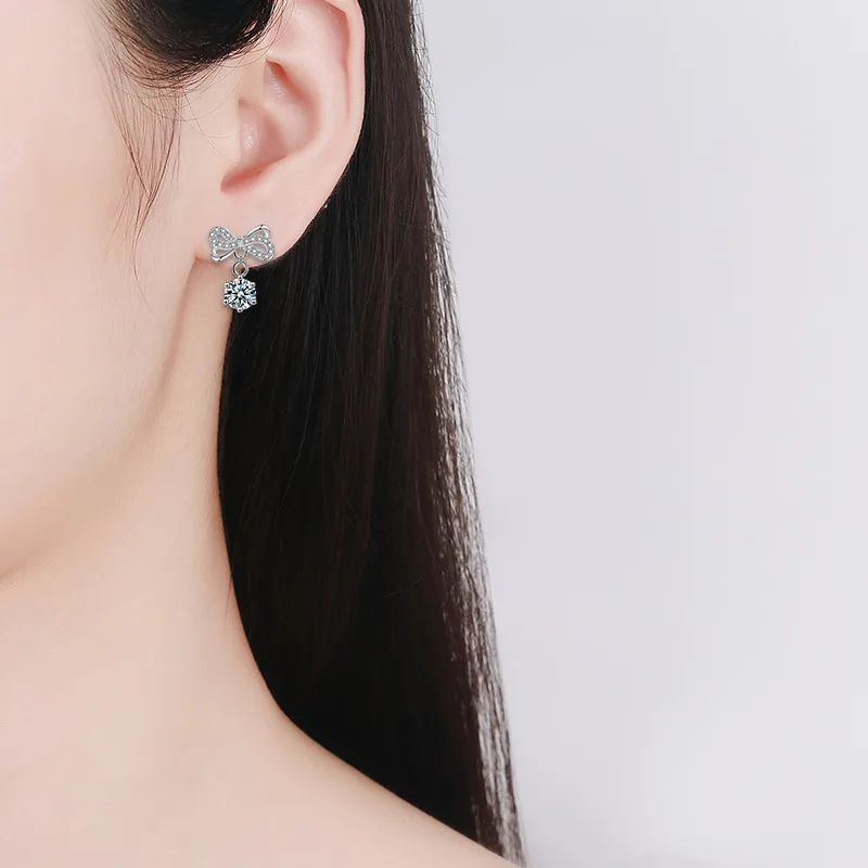 Chiếc bông tai được chế tác từ bạc S925 cao cấp, kết hợp cùng viên kim cương Moissanite 0.5 carat lấp lánh, mang đến vẻ đẹp rực rỡ và sang trọng ngay từ ánh nhìn đầu tiên. Thiết kế hình chiếc nơ mềm mại tượng trưng cho sự nữ tính, duyên dáng và tinh tế.