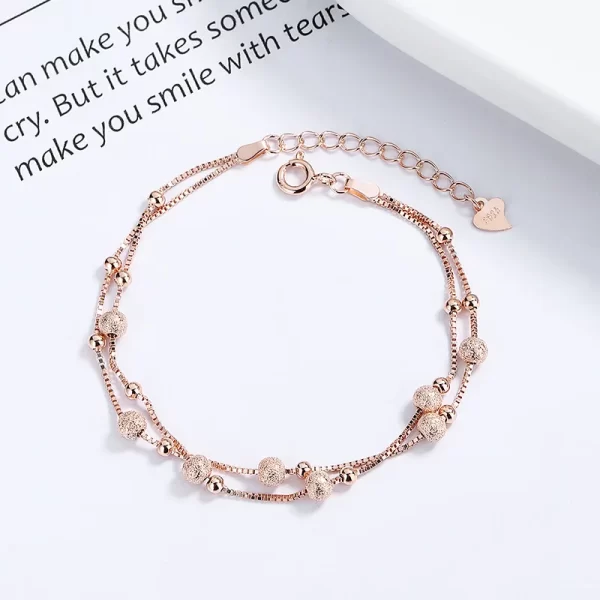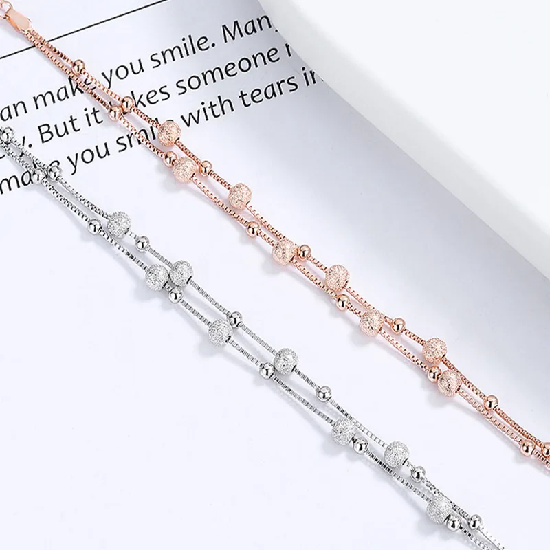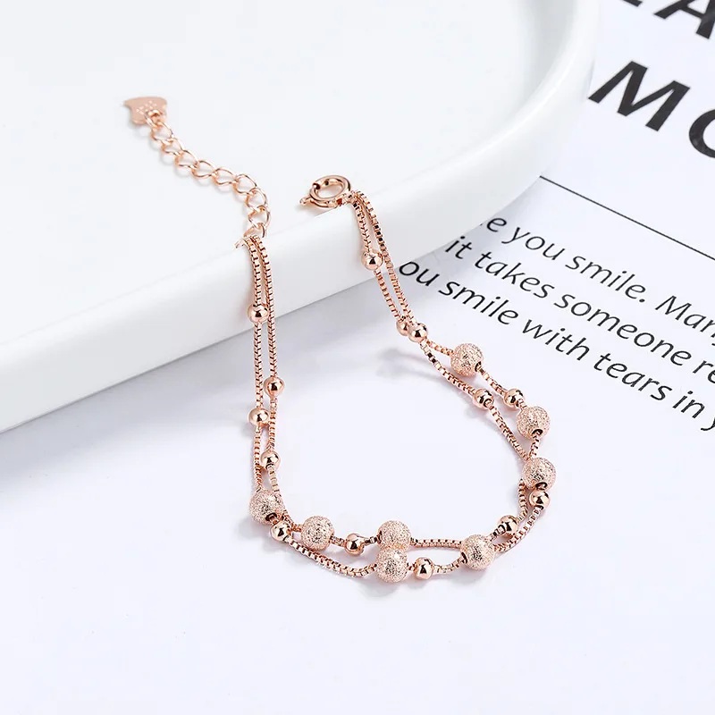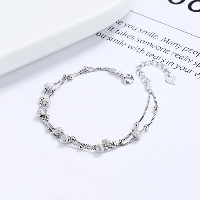 Thiết kế lắc tay hai tầng với các hạt tròn bi cát lấp lánh, tạo điểm nhấn tinh tế và chuyển động nhẹ nhàng trên cổ tay. Sự kết hợp giữa các hạt trơn và hạt bi cát mang lại vẻ đẹp thanh lịch, nữ tính nhưng vẫn đủ nổi bật để thu hút ánh nhìn.