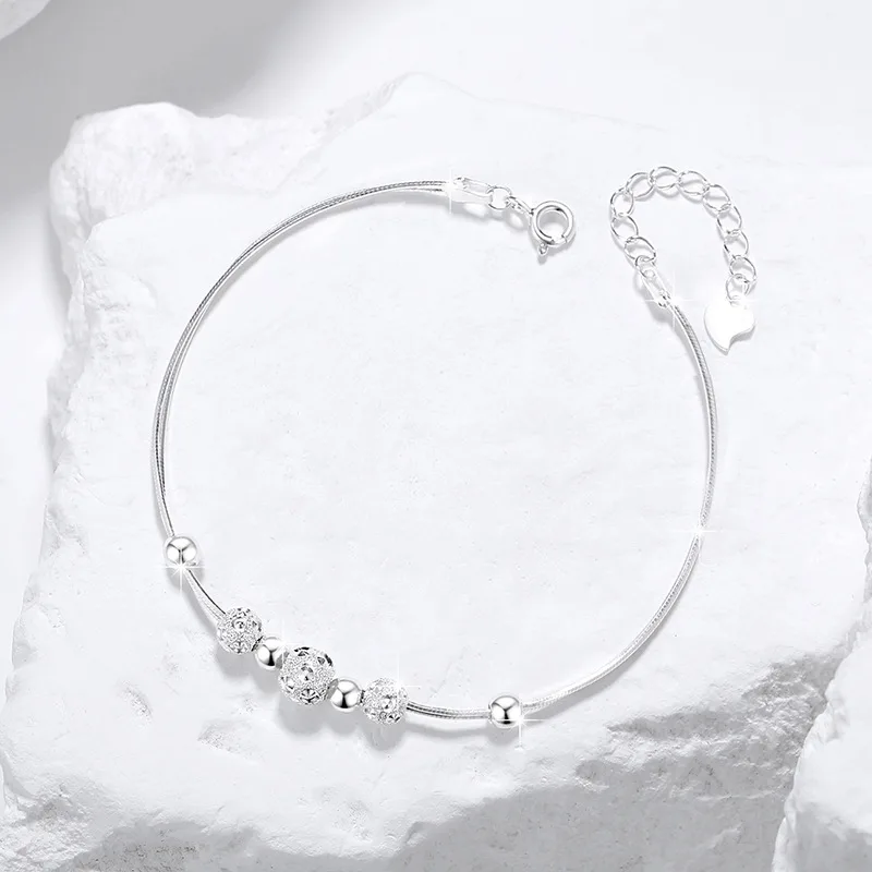 Thiết kế chuỗi hạt tròn tinh xảo mang lại vẻ đẹp nhẹ nhàng nhưng vẫn nổi bật. Những hạt bạc được chế tác tỉ mỉ kết hợp cùng các chi tiết đính đá lấp lánh tạo nên điểm nhấn sang trọng, giúp cổ tay trở nên thanh thoát và cuốn hút hơn.
