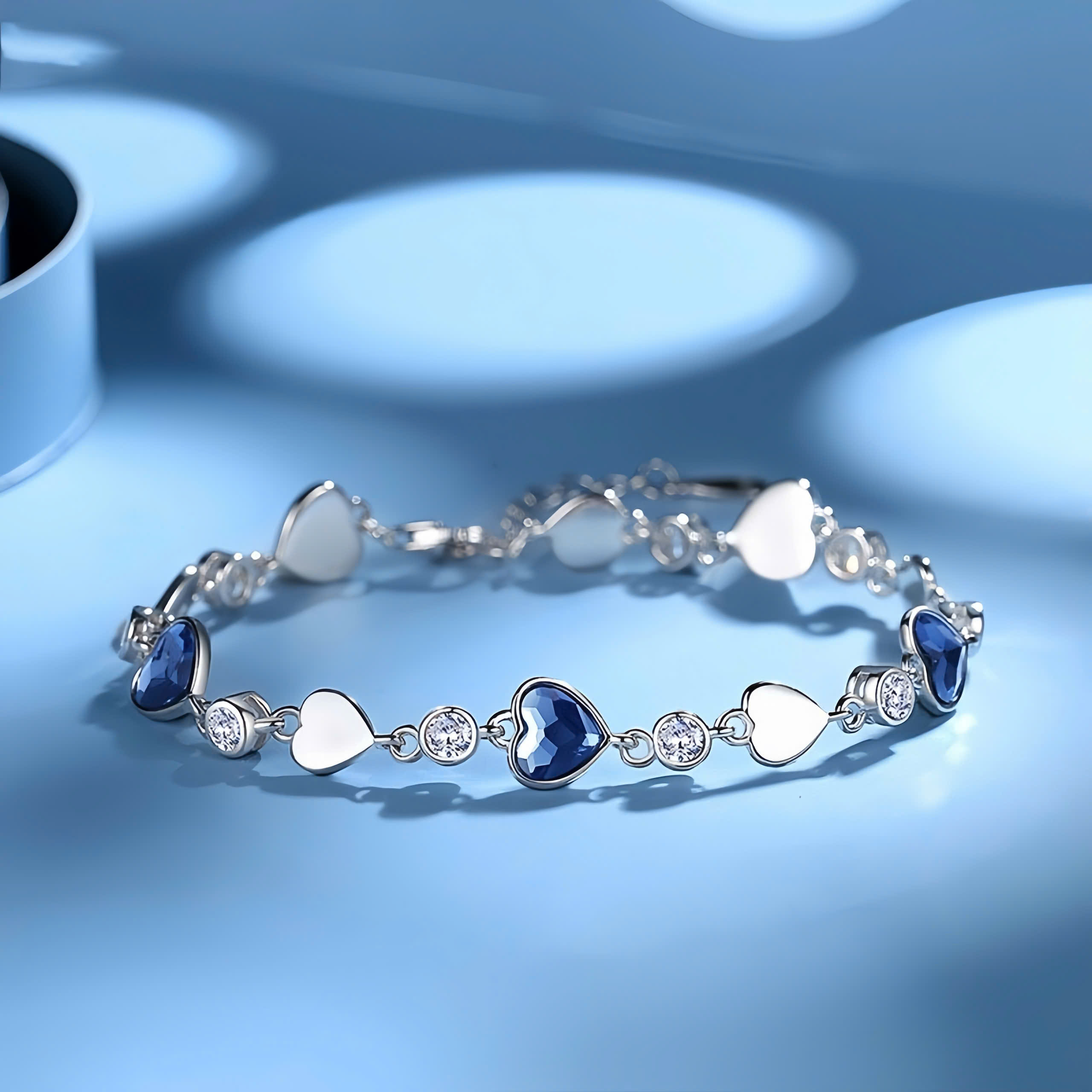Thiết kế nổi bật với những viên đá CZ xanh ánh biển cắt giác dạng trái tim, xen kẽ các trái tim bạc mềm mại và đá trắng lấp lánh, tạo nên tổng thể tinh tế và đầy nữ tính. Hình trái tim tượng trưng cho tình yêu, sự gắn kết và vẻ đẹp ngọt ngào, trong khi sắc xanh biển mang ý nghĩa bình yên, sâu sắc và niềm tin vững bền.