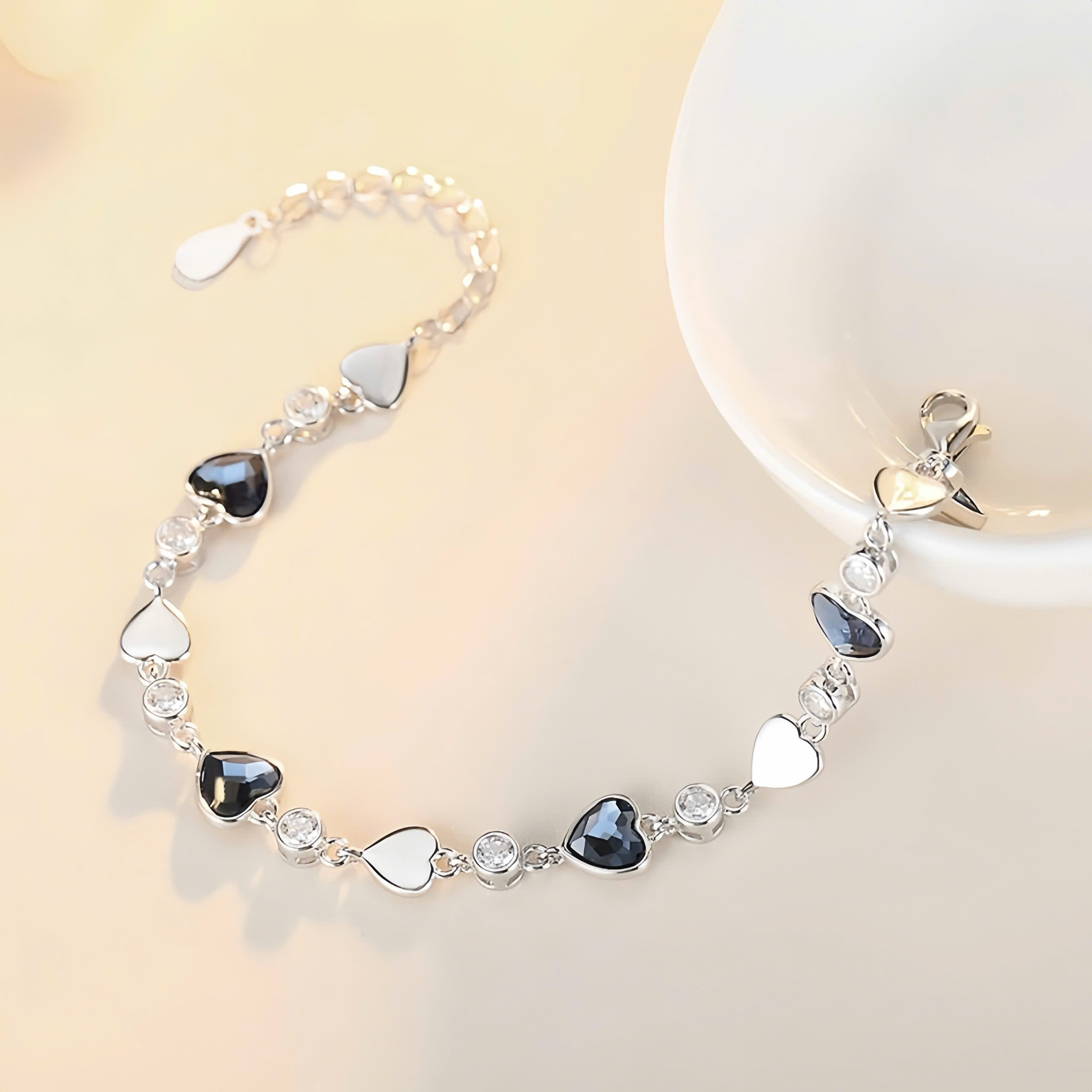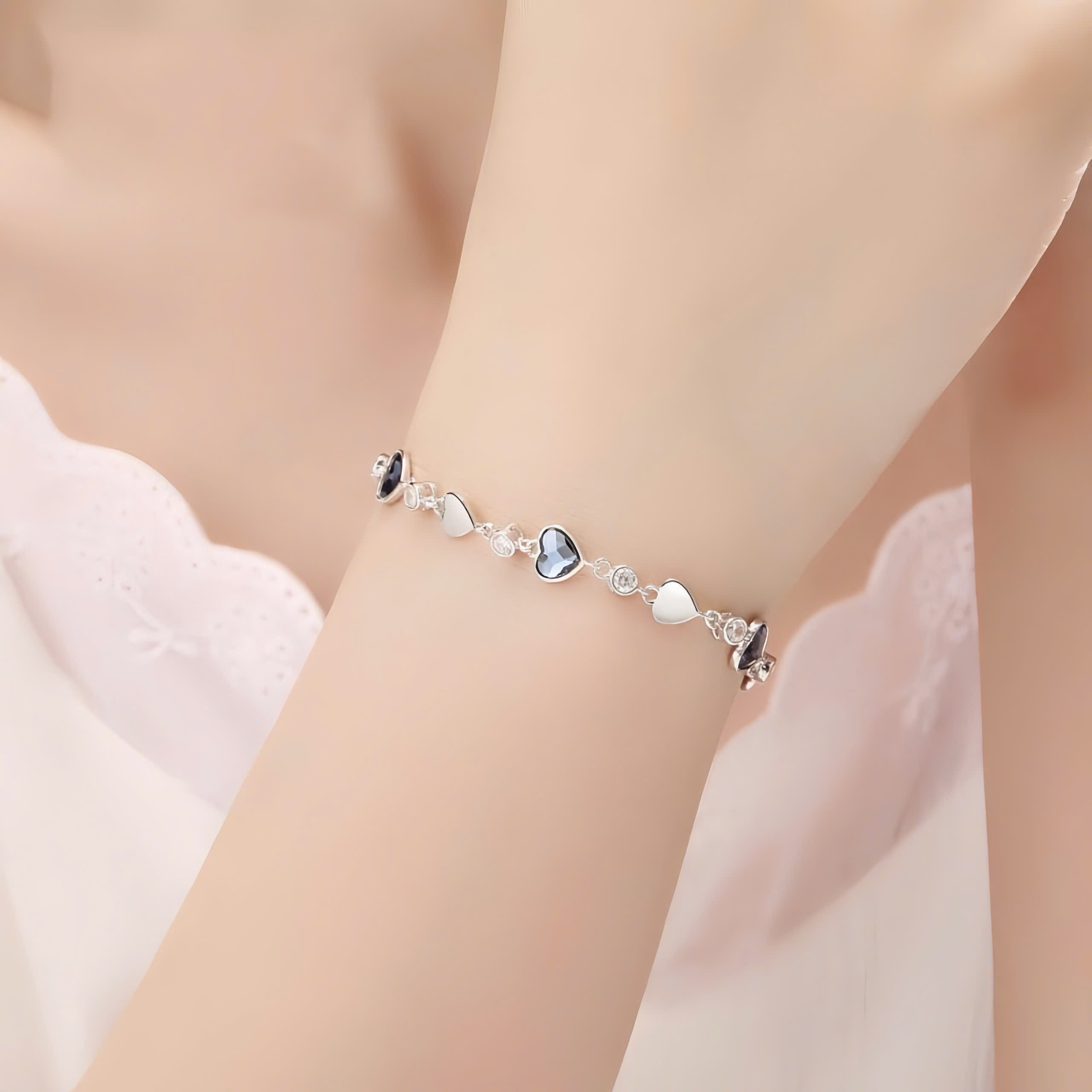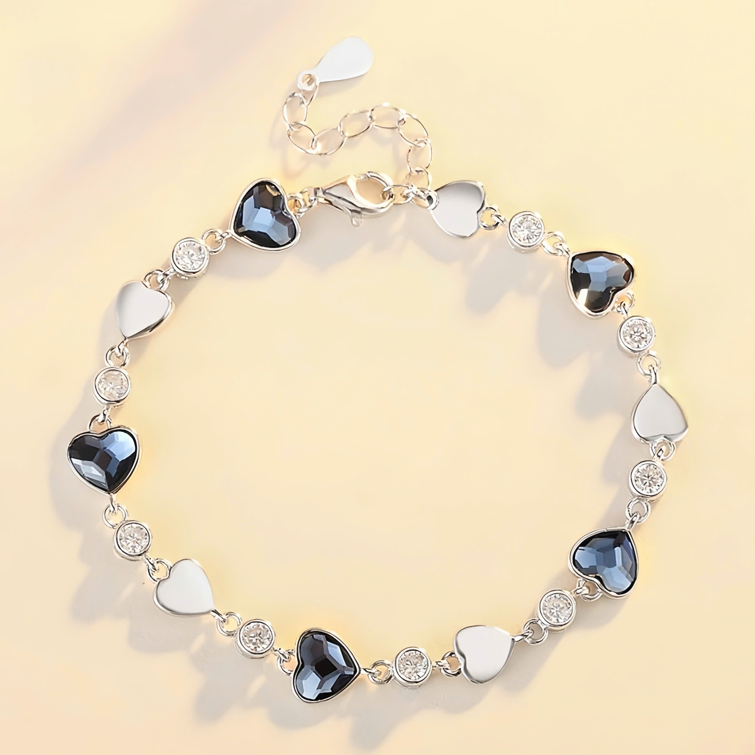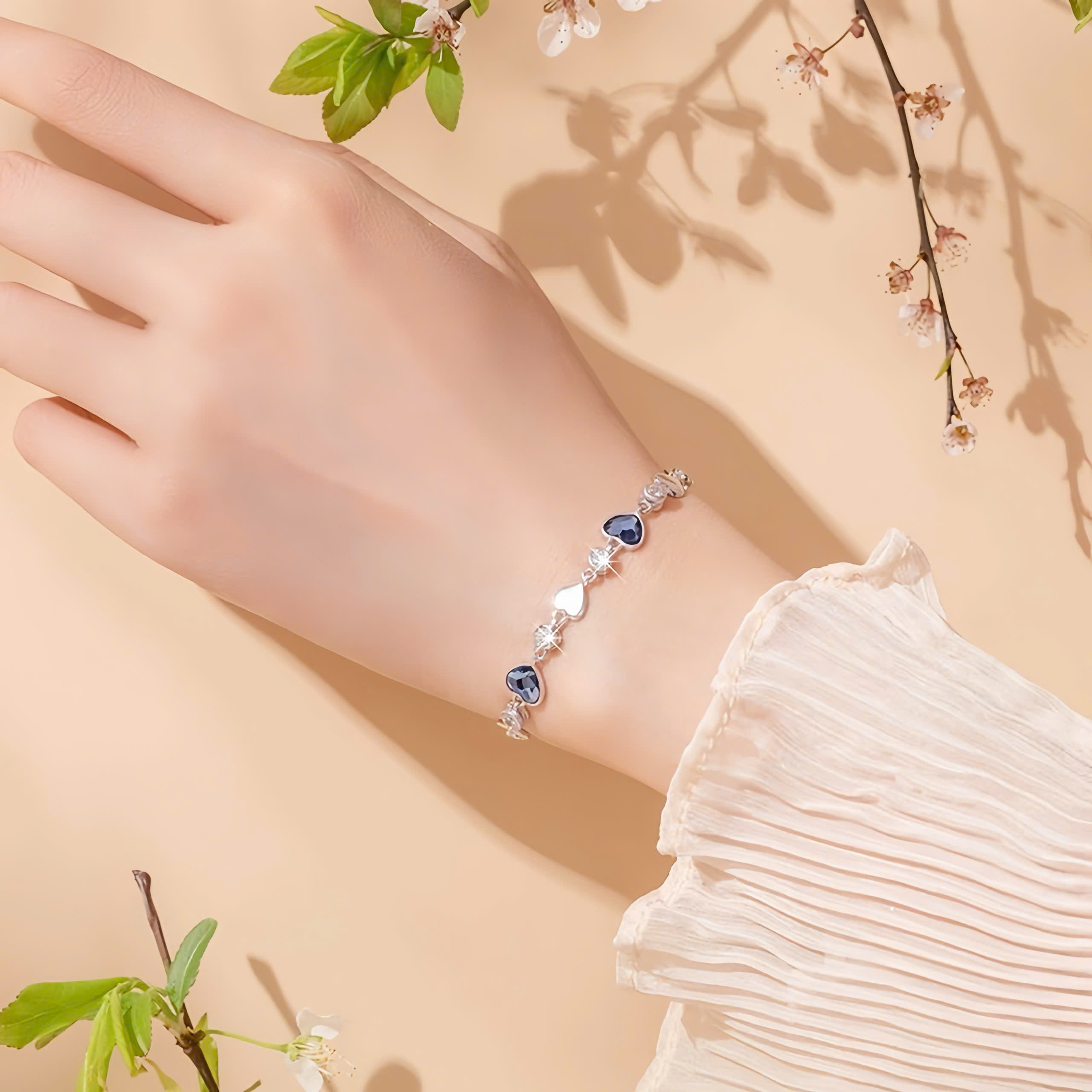 Thiết kế nổi bật với những viên đá CZ xanh ánh biển cắt giác dạng trái tim, xen kẽ các trái tim bạc mềm mại và đá trắng lấp lánh, tạo nên tổng thể tinh tế và đầy nữ tính. Hình trái tim tượng trưng cho tình yêu, sự gắn kết và vẻ đẹp ngọt ngào, trong khi sắc xanh biển mang ý nghĩa bình yên, sâu sắc và niềm tin vững bền.