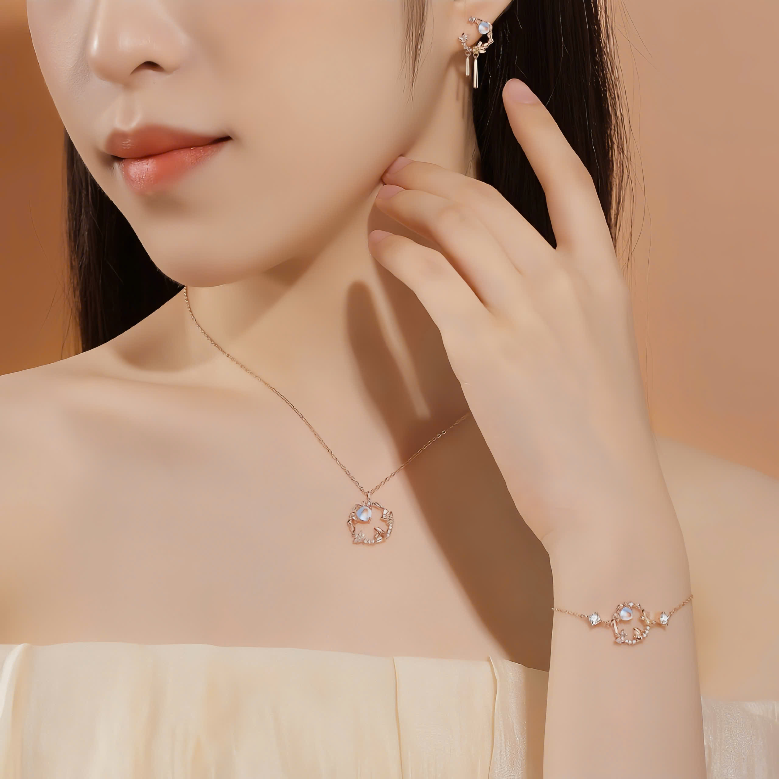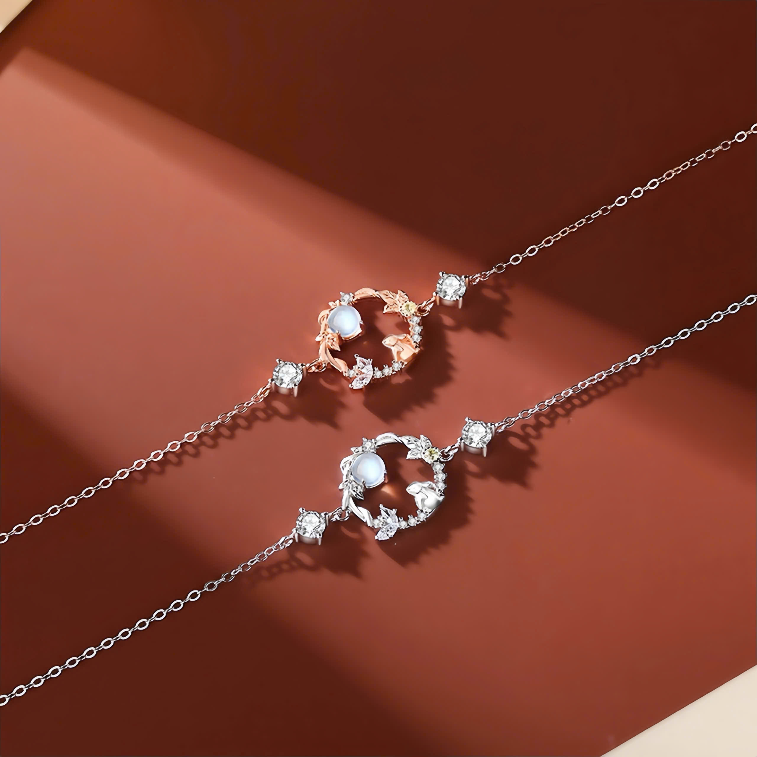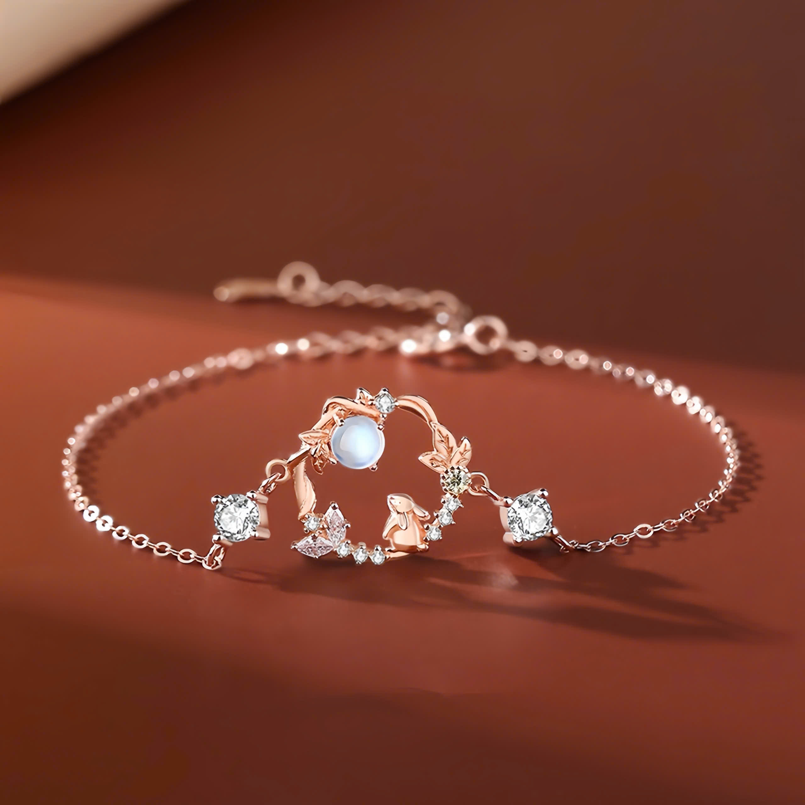 Lấy cảm hứng từ khoảnh khắc thỏ ngắm trăng đầy thơ mộng, chiếc lắc tay mang vẻ đẹp dịu dàng và thanh khiết. Họa tiết mặt trăng và chú thỏ nhỏ được điểm xuyết bằng đá CZ lấp lánh, tượng trưng cho ước mơ, hy vọng và sự bình yên nội tại.