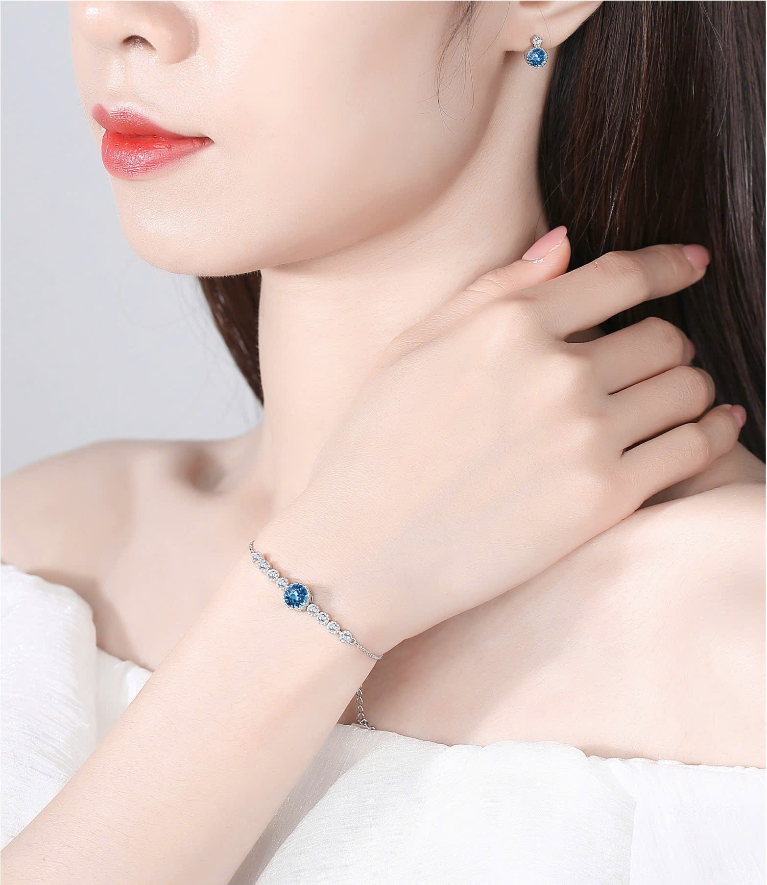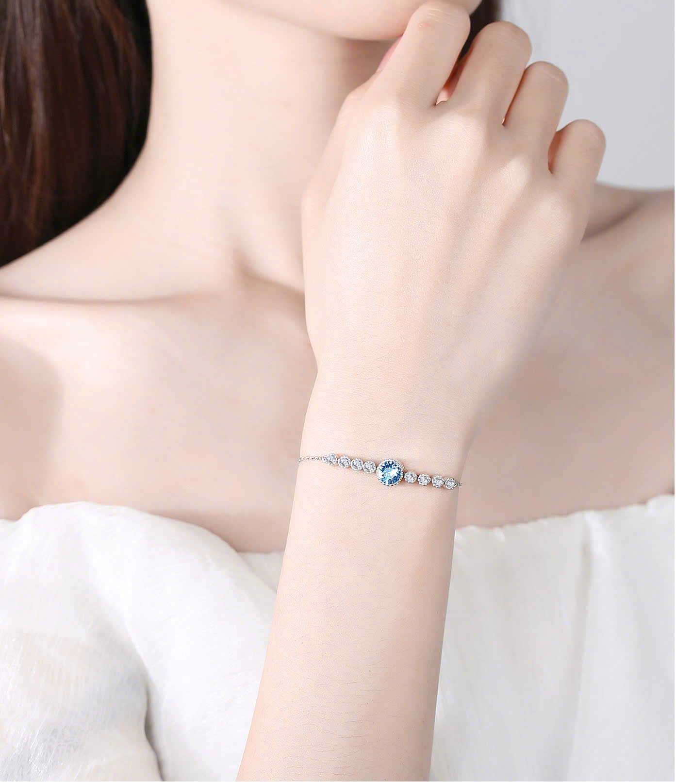 Thiết kế nổi bật với viên đá Swarovski xanh ở trung tâm, tỏa sáng nhẹ nhàng như ánh nước, kết hợp cùng những viên đá trắng li ti hai bên tạo hiệu ứng lấp lánh đầy cuốn hút. Đá Swarovski tượng trưng cho sự tinh khiết, sang trọng và nguồn năng lượng tích cực, giúp chủ nhân luôn tự tin và tỏa sáng trong mọi khoảnh khắc.