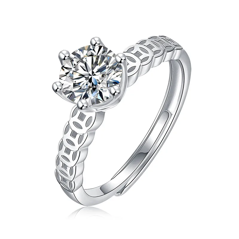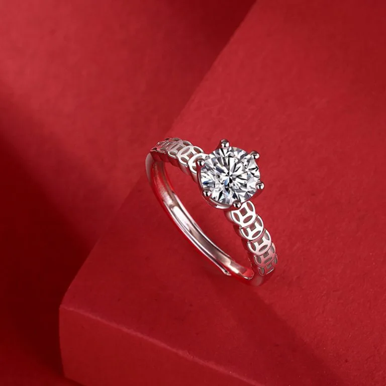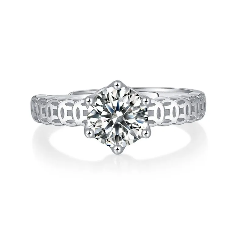 Chiếc nhẫn được chế tác từ bạc S925 cao cấp, đính viên kim cương Moissanite 1 carat lấp lánh, kết hợp thiết kế hình kim tiền tượng trưng cho tài lộc và may mắn. Tổng thể mang đến vẻ sang trọng, quý phái và đầy thu hút, giúp bạn nổi bật trong mọi hoàn cảnh từ đi làm, dự tiệc đến dạo phố.