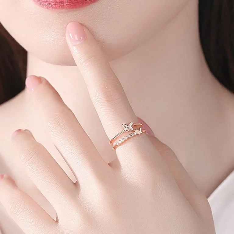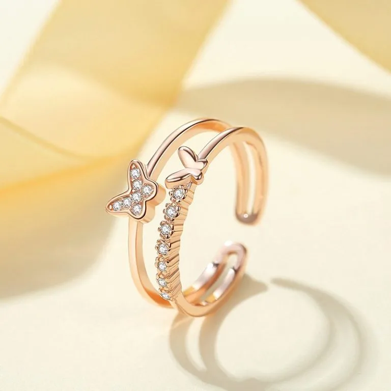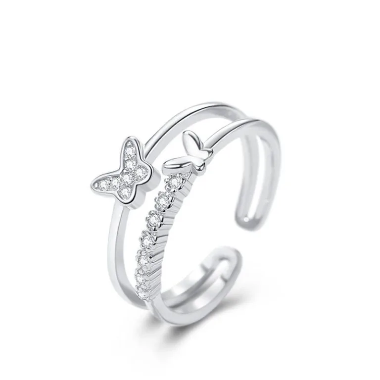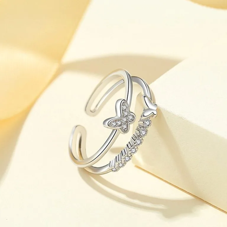 Thiết kế 2 tầng độc đáo với hình ảnh đôi bướm tượng trưng cho tình yêu và sự tự do, tạo cảm giác nhẹ nhàng, nữ tính nhưng vẫn nổi bật. Chất liệu bạc S925 mạ vàng kết hợp cùng đá CZ lấp lánh giúp tổng thể thêm phần sang trọng, cuốn hút. Mẫu nhẫn không chỉ tôn lên vẻ đẹp thanh lịch mà còn mang ý nghĩa may mắn, hạnh phúc – phù hợp đeo hằng ngày hoặc làm quà tặng tinh tế.